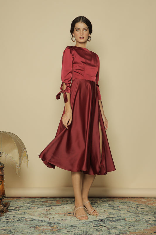 CORALIE Longsleeve Midi Dress with Slit Skirt and Tie on Wrist (Maroon Silk)Regular price ₱3,690.00Regular priceUnit price / per-