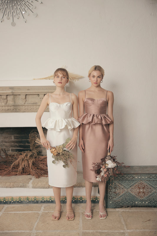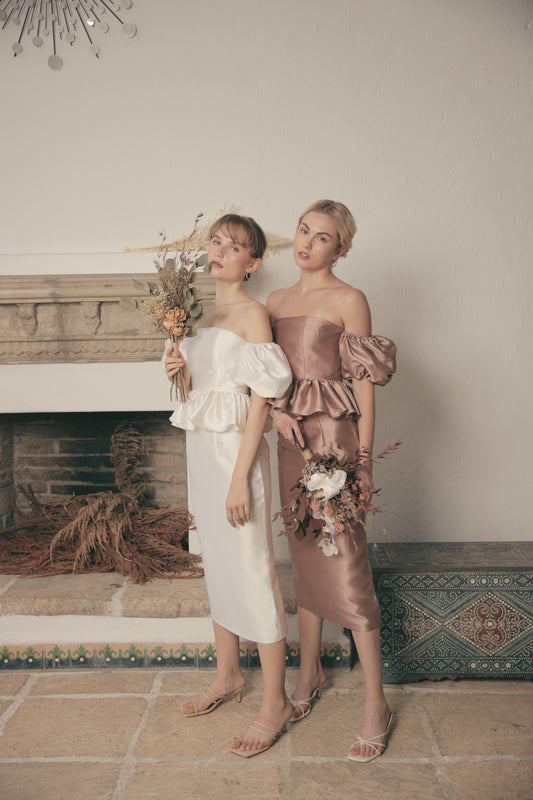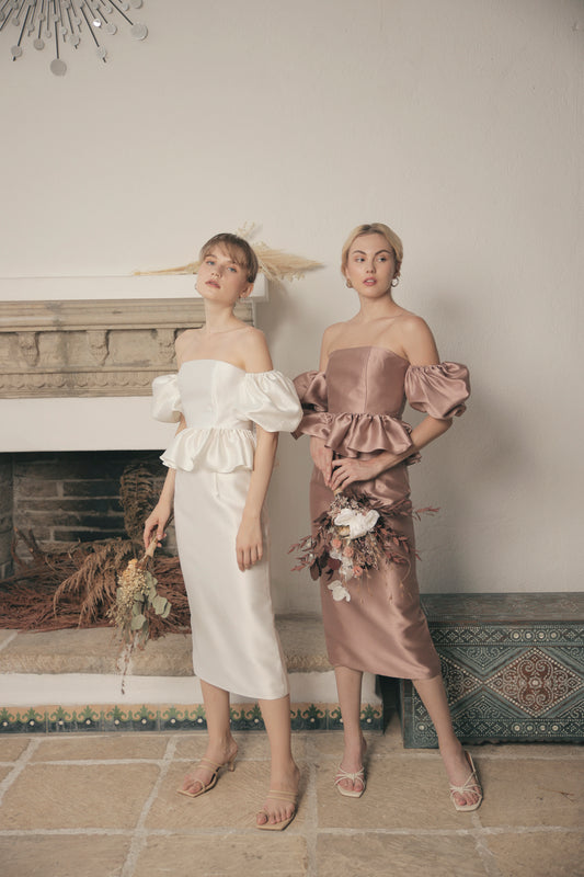 AMELIE Two Piece Bustier Peplum Top with Removable Puff Sleeves and Pencil Skirt (Taupe Gazaar)Regular price ₱5,990.00Regular priceUnit price / per-