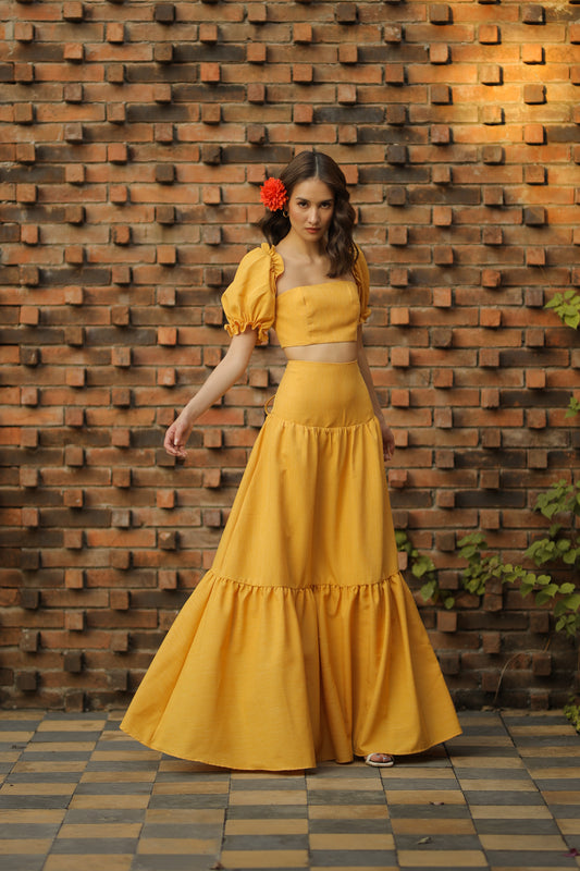 PALMIRA DRESS Puff Sleeve Crop Blouse with Cross Tie Back and High Waist Shirred Maxi Skirt (Yellow Chambray)Regular price ₱5,490.00Regular priceUnit price / per-