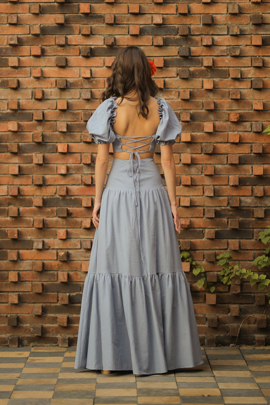 PALMIRA DRESS Puff Sleeve Crop Blouse with Cross Tie Back and High Waist Shirred Maxi Skirt (Serenity Blue Linen)Regular price ₱5,490.00Regular priceUnit price / per-