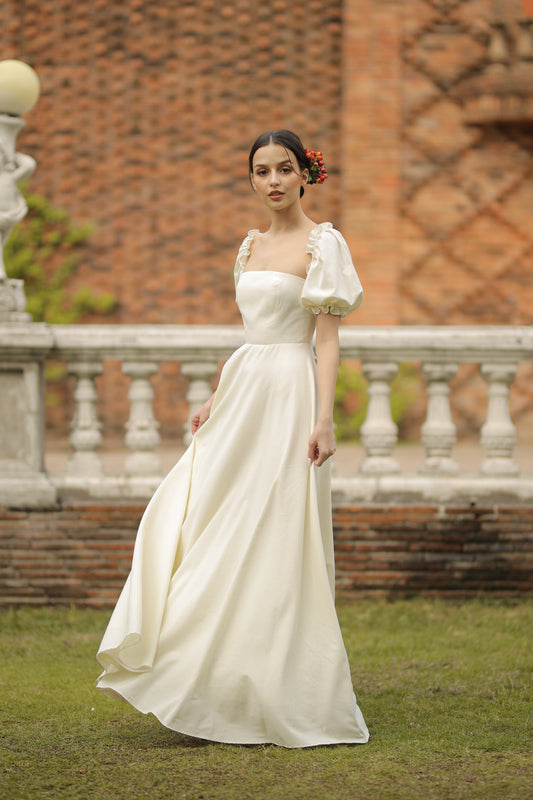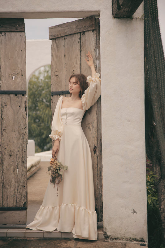 FIRA Two Way Puff Sleeve Maxi Dress with Covered Buttons and Square Neckline (Cream Silk)Regular price ₱5,490.00Regular priceUnit price / per-