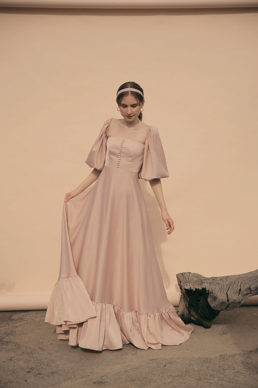 FIRA Two Way Puff Sleeve Maxi Dress with Covered Buttons and Square Neckline (Light Nude Silk)Regular price ₱5,490.00Regular priceUnit price / per-