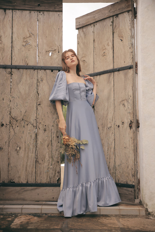 FIRA Two Way Puff Sleeve Maxi Dress with Covered Buttons and Square Neckline (Serenity Blue Silk)Regular price ₱5,490.00Regular priceUnit price / per-