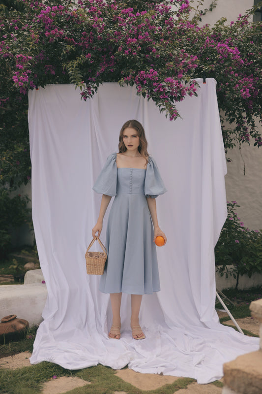 MARSEILLE Two Way Puff Sleeve Midi Dress with Covered Buttons and Square Neckline (Serenity Blue Linen)Regular price ₱3,690.00Regular priceUnit price / per-