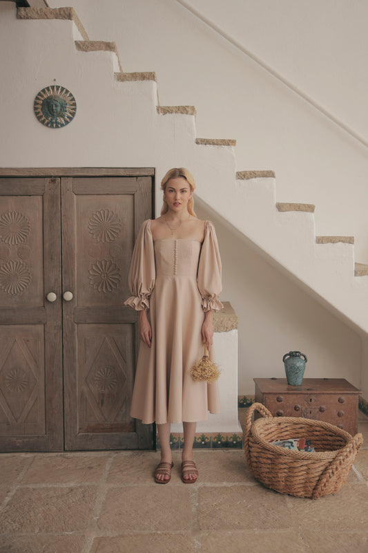 MARSEILLE Two Way Puff Sleeve Midi Dress with Covered Buttons and Square Neckline (Nude Linen)Regular price ₱3,690.00Regular priceUnit price / per-