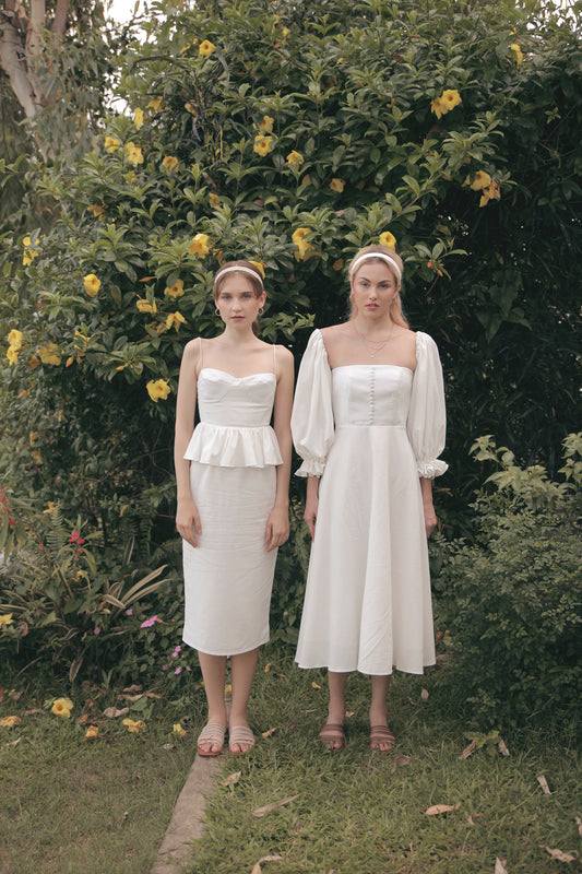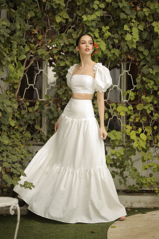 PALMIRA DRESS Puff Sleeve Crop Blouse with Cross Tie Back and High Waist Shirred Maxi Skirt (White Linen)Regular price ₱5,490.00Regular priceUnit price / per
