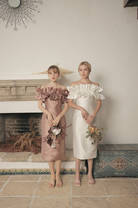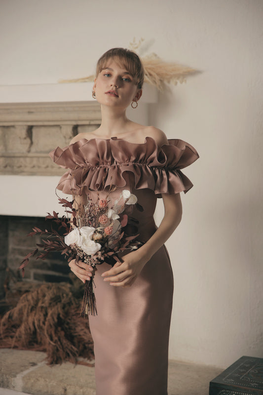 GENOVIEVE Bustier Midi Gown with Oversize Ruffled Neckline and Pencil Skirt (Taupe Gazaar)Regular price ₱5,990.00Regular priceUnit price / per-