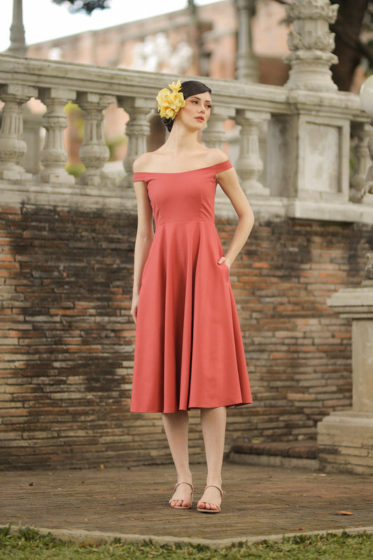 BEATRIZ Off Shoulder Midi Dress with Pockets (Rust Linen)