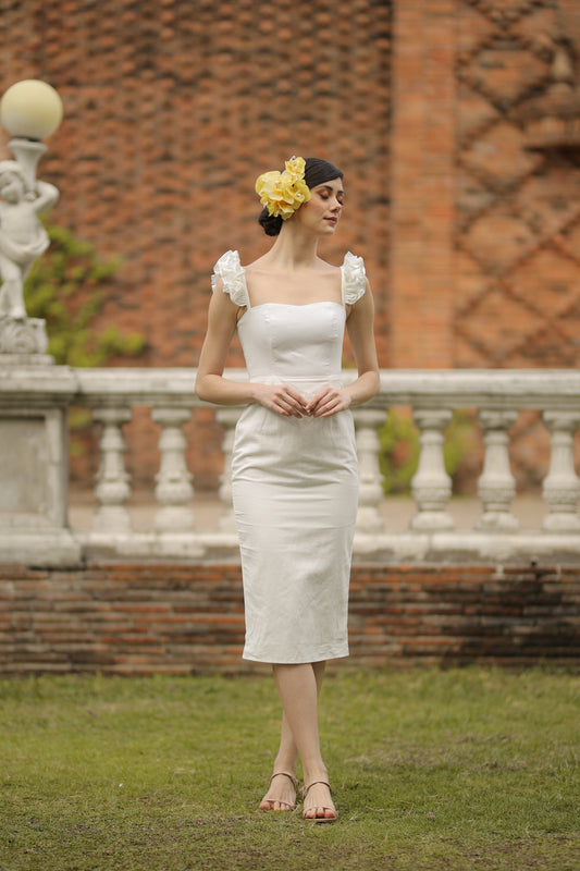 MILAGROS Semi Sweetheart Ruffle Sleeve Top with Pencil Midi Skirt (White Linen)