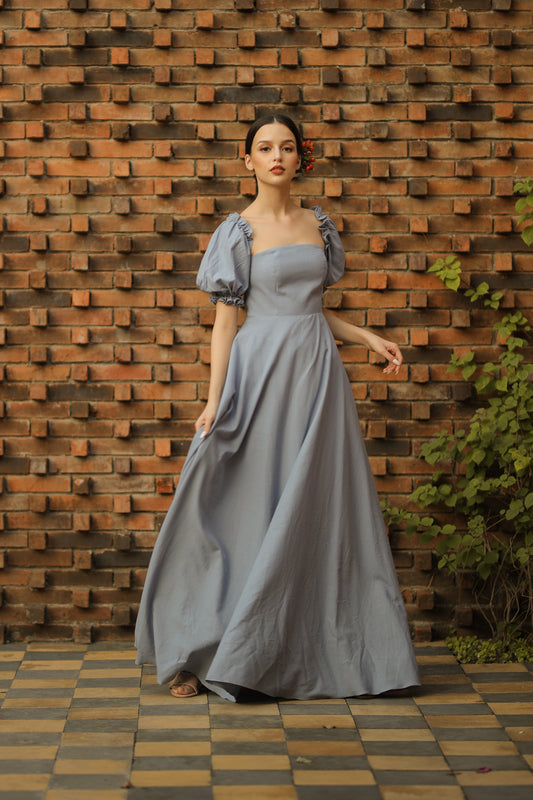 CONCEPCION Puff Sleeve Cross Tie Back Maxi Dress (Serenity Blue Linen)