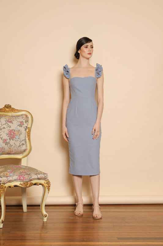 MILAGROS Semi Sweetheart Ruffle Sleeve Top with Pencil Midi Skirt (Serenity Blue Linen)