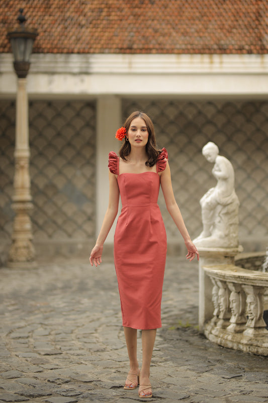 MILAGROS Semi Sweetheart Ruffle Sleeve Top with Pencil Midi Skirt (Rust Linen)
