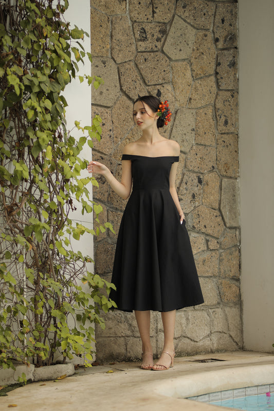 BEATRIZ Off Shoulder Midi Dress with Pockets (Black Linen)