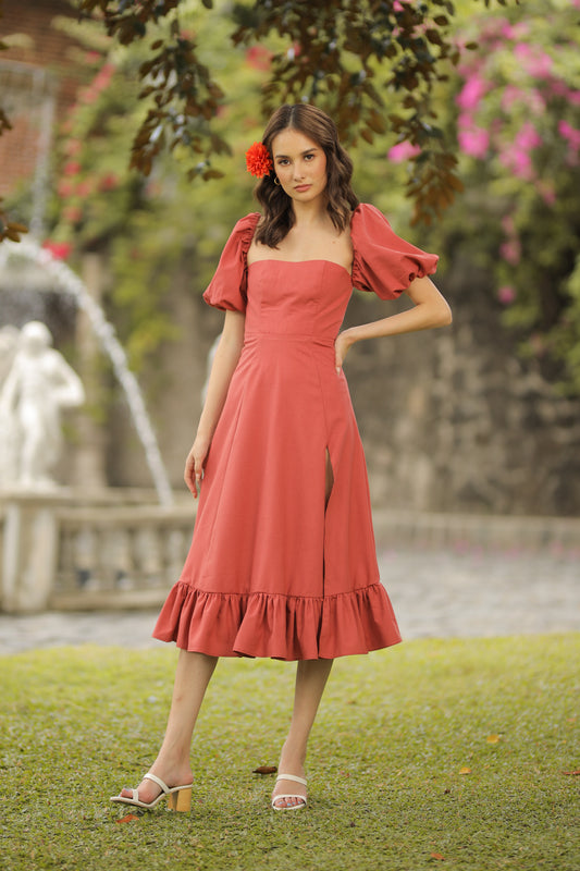 MARCELA Puff Sleeve Semi Sweetheart Midi Dress with Slit and Ruffle Hem (Rust Linen)