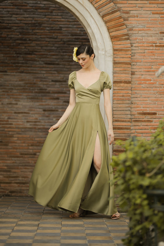 CASSANDRA Puff Sleeve Silk Maxi Dress with High Slit (Olive Silk Crepe)