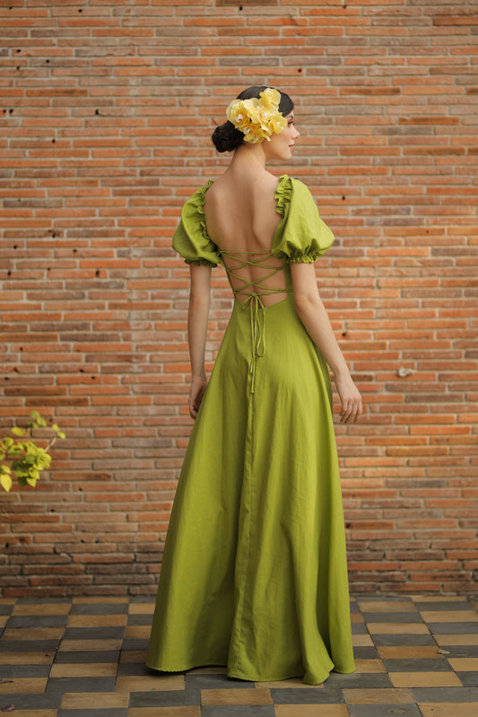 CONCEPCION Puff Sleeve Cross Tie Back Maxi Dress (Lime Green Linen)