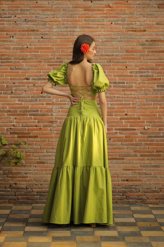 PALMIRA DRESS Puff Sleeve Crop Blouse with Cross Tie Back and High Waist Shirred Maxi Skirt (Lime Green Linen)