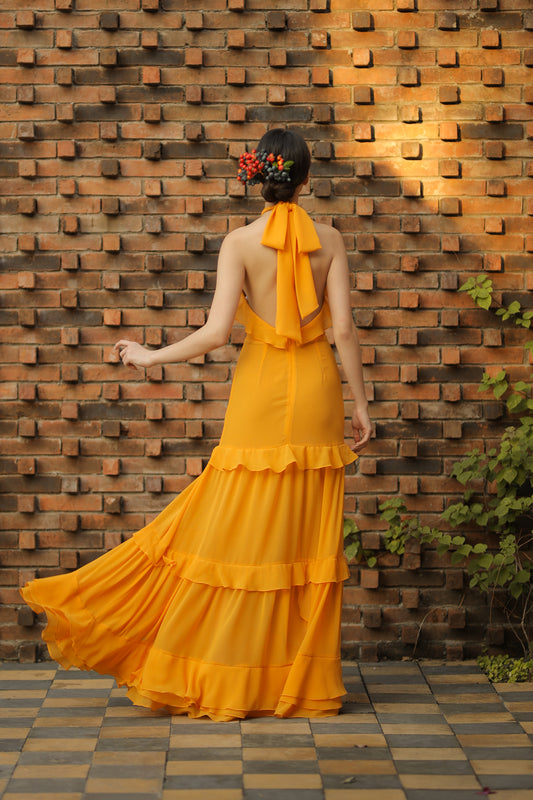 HERMOSA Chiffon Maxi with Layered Ruffles and Tie Back (Marigold Chiffon)