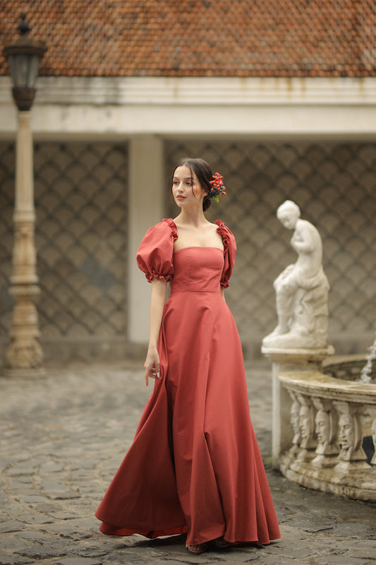 CASSANDRA Puff Sleeve Silk Maxi Dress with High Slit (Rust Silk)