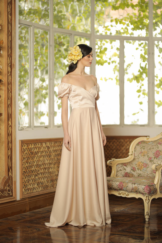 CASSANDRA Puff Sleeve Silk Maxi Dress with High Slit (Light Nude Silk)