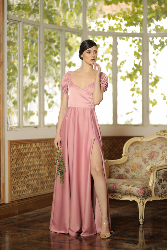 CASSANDRA Puff Sleeve Silk Maxi Dress with High Slit (Old Rose Silk)