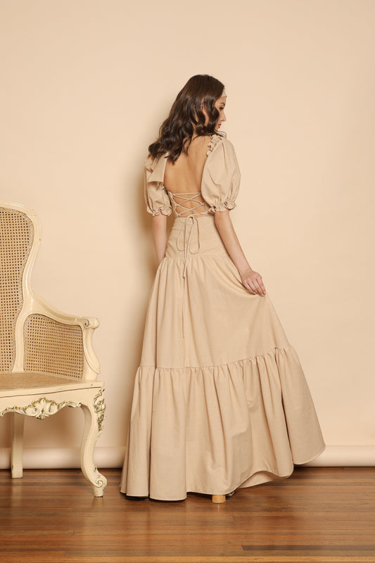 PALMIRA DRESS Puff Sleeve Crop Blouse with Cross Tie Back and High Waist Shirred Maxi Skirt (Nude Linen)