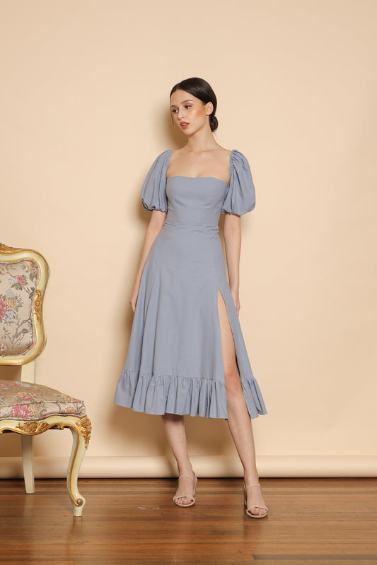 MARCELA Puff Sleeve Semi Sweetheart Midi Dress with Slit and Ruffle Hem (Serenity Blue Linen)