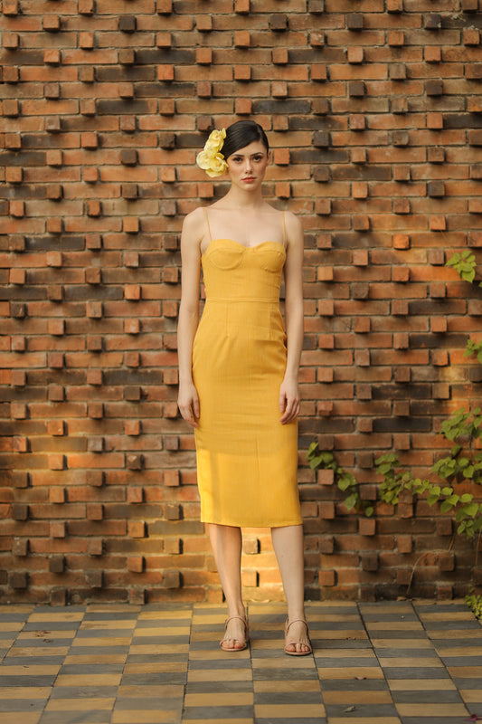 CHIQUITA Sweetheart Midi Dress with Thin Straps (Yellow Chambray)