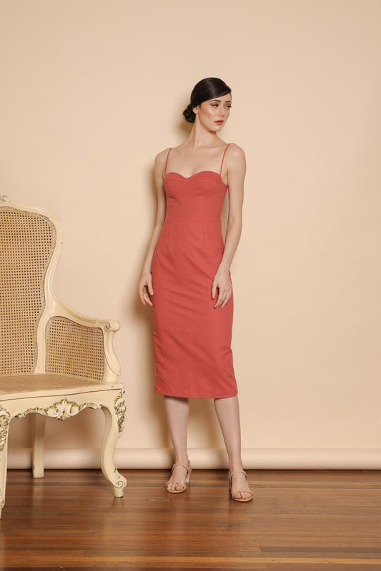 CHIQUITA Sweetheart Midi Dress with Thin Straps (Rust Linen)
