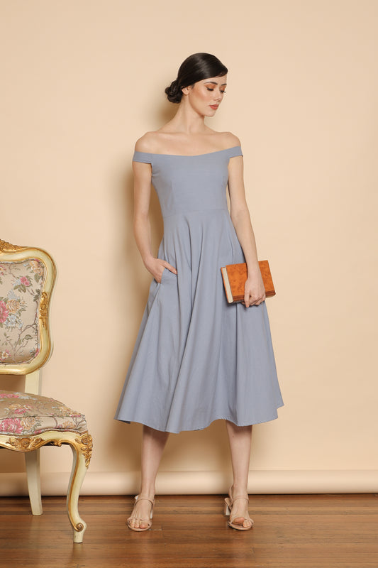 BEATRIZ Off Shoulder Midi Dress with Pockets (Serenity Blue Linen)
