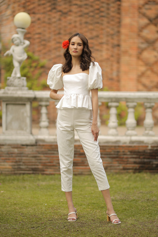CLARA PANTS SET Peplum Puff Sleeve Blouse (White Linen)