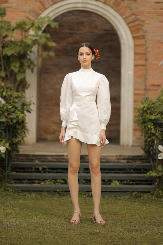 RAFAELLA Puff Sleeve Mini Dress with Cascading Ruffles and Covered Buttons (White Linen)
