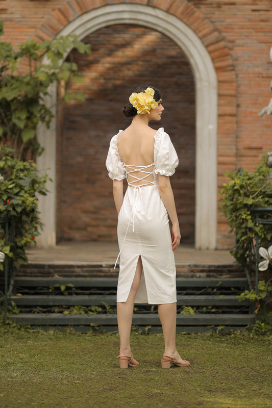 MARICRUZ Puff Sleeve Cross Tie Back Midi Dress (White Linen)