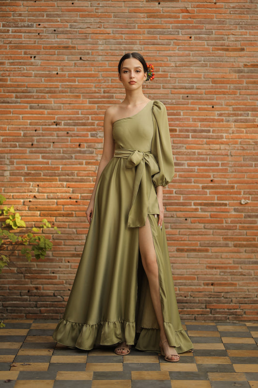 ESMERALDA Asymmetric Puff Sleeve Silk Maxi Dress with Ruffled Hem and Detachable Waist Tie (Olive Silk Crepe)