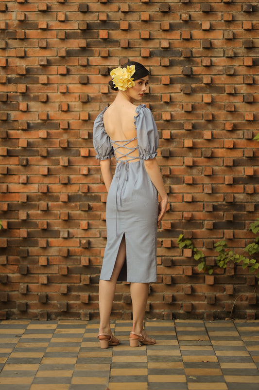 MARICRUZ Puff Sleeve Cross Tie Back Midi Dress (Serenity Blue Linen)