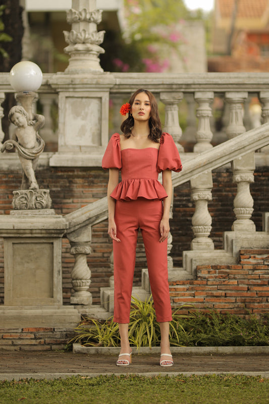 CLARA PANTS SET Peplum Puff Sleeve Blouse (Rust Linen)