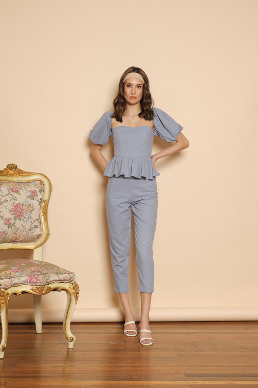 CLARA PANTS SET Peplum Puff Sleeve Blouse (Serenity Blue Linen)
