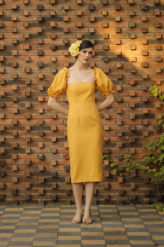MARICRUZ Puff Sleeve Cross Tie Back Midi Dress (Yellow Chambray)