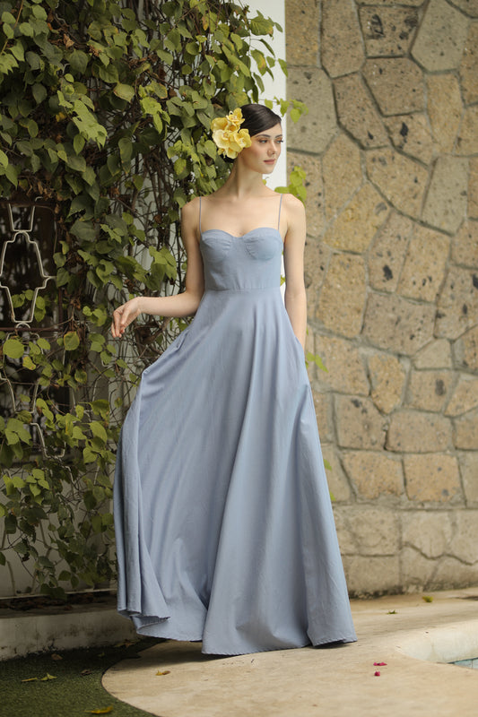 MARIPOSA Sweetheart Neckline Maxi dress with Pockets (Serenity Blue Linen)