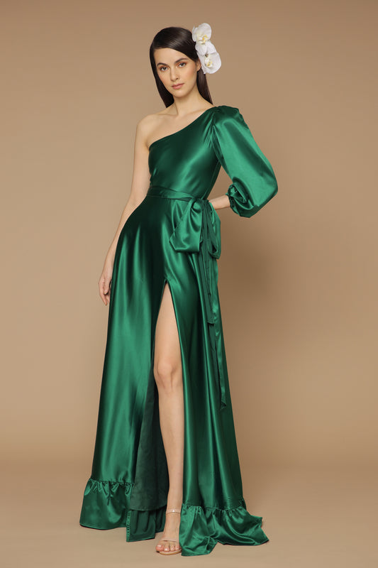 ESMERALDA Asymmetric Puff Sleeve Silk Maxi Dress with Ruffled Hem and Detachable Waist Tie (Emerald Silk)Regular price ₱4,750.00Regular priceUnit price / per-