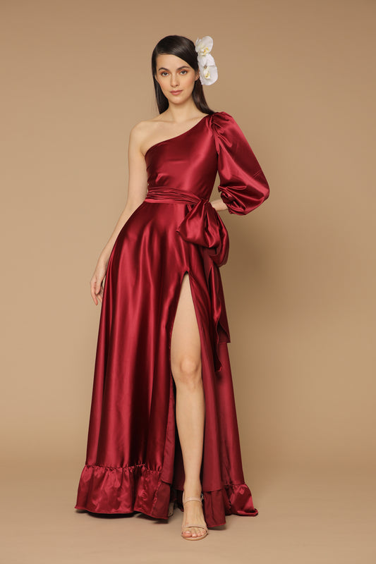 ESMERALDA Asymmetric Puff Sleeve Silk Maxi Dress with Ruffled Hem and Detachable Waist Tie (Maroon Silk)Regular price ₱4,750.00Regular priceUnit price / per-