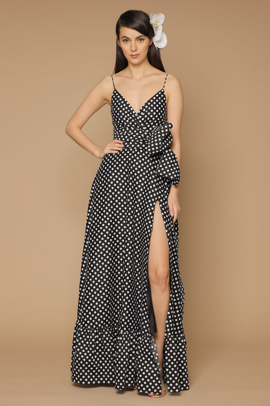 MARGARITA Deep V Maxi with High Slit Skirt and Ruffled Hem with Detachable Waist Tie (Polkadot Black and White)Regular price ₱4,900.00Regular priceUnit price / per-