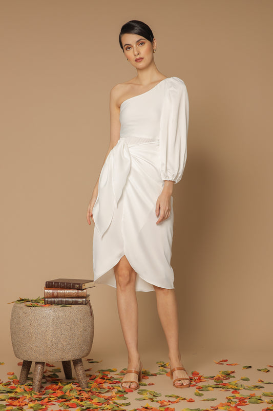 BAJA Asymmetric Puff Sleeve Silk Midi Dress with Wrap Tulip Skirt (White Silk)Regular price ₱3,590.00Regular priceUnit price / per-
