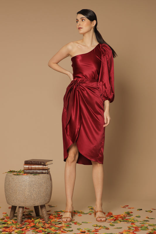 BAJA Asymmetric Puff Sleeve Silk Midi Dress with Wrap Tulip Skirt (Maroon Silk)Regular price ₱3,590.00Regular priceUnit price / per-