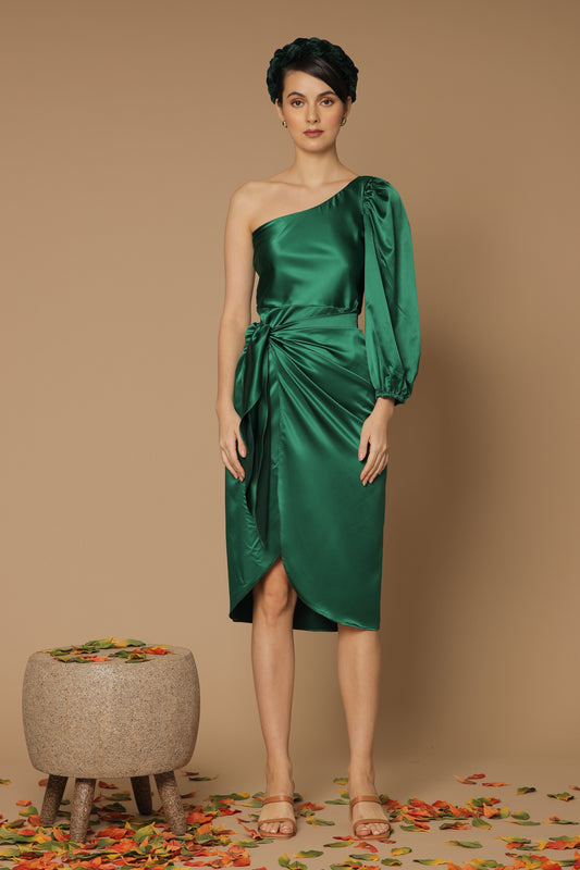 BAJA Asymmetric Puff Sleeve Silk Midi Dress with Wrap Tulip Skirt (Emerald Silk)Regular price ₱3,590.00Regular priceUnit price / per-