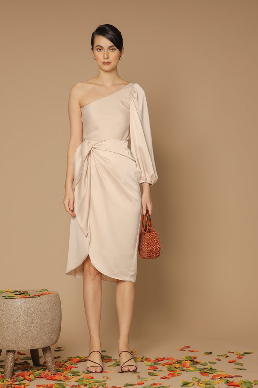 BAJA Asymmetric Puff Sleeve Silk Midi Dress with Wrap Tulip Skirt (Light Nude Silk)Regular price ₱3,590.00Regular priceUnit price / per-