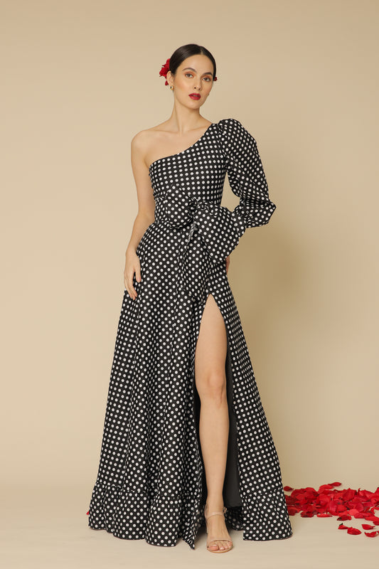 ESMERALDA Asymmetric Puff Sleeve Silk Maxi Dress with Ruffled Hem and Detachable Waist Tie (Polkadot Black and White)Regular price ₱4,750.00Regular priceUnit price / per-