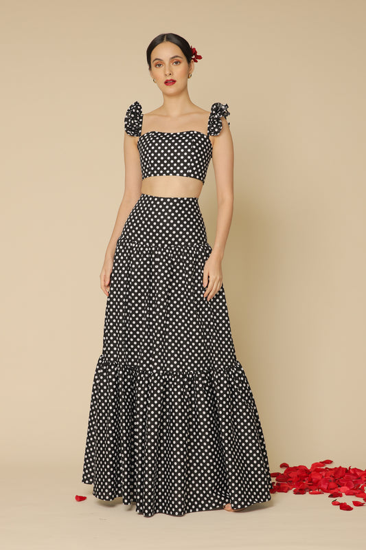 GUADA DRESS Crop Ruffle Top and High Waist Shirred Maxi Skirt (Polkadot Black and White)Regular price ₱4,990.00Regular priceUnit price / per-