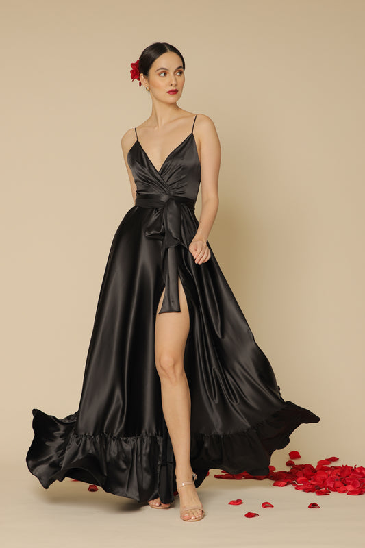 MARGARITA Deep V Maxi with High Slit Skirt and Ruffled Hem with Detachable Waist Tie (Black Silk)Regular price ₱4,900.00Regular priceUnit price / per-