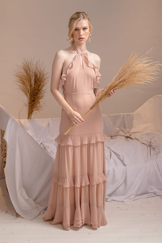 SARITA Deep V Halter Chiffon Maxi Dress with Ruffles (Tan Chiffon)Regular price ₱5,150.00Regular priceUnit price / per-
